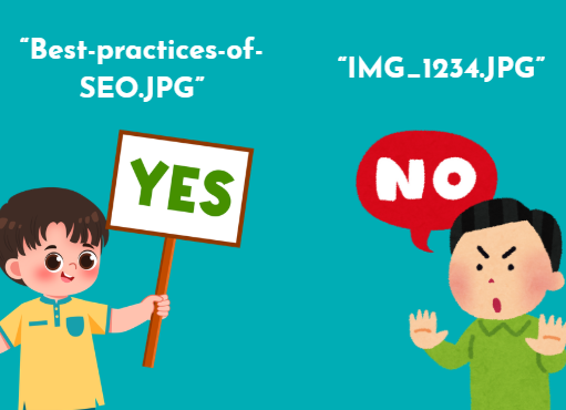 The name of your image files should describe what they're about. Often, default names like IMG_0123.jpg do no good to your site's SEO. Make sure to rename such files with clear, keyword-relevant names.