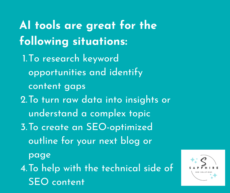 Use AI tools for keyword research opportunities, identify content gaps, and analyze search trends. Remember: data analysis with AI should inform decisions, not make them for you. Check out our page on keyword research to learn more about this topic.