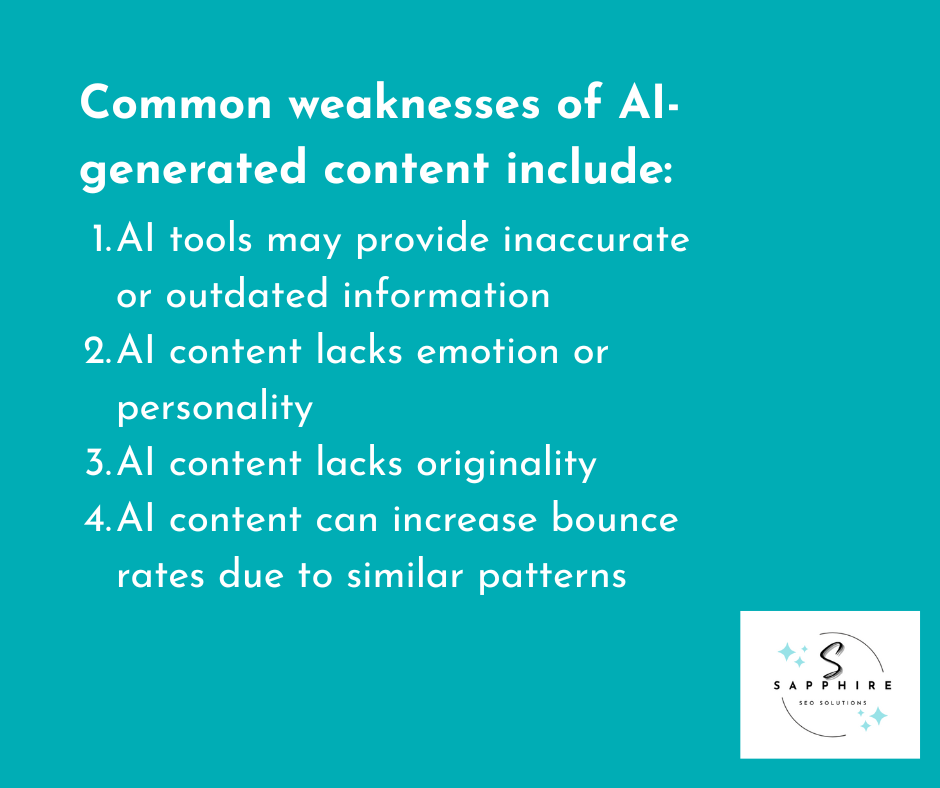 AI content also lacks a unique voice and storytelling with human emotion. This can affect trust and loyalty among the readers.