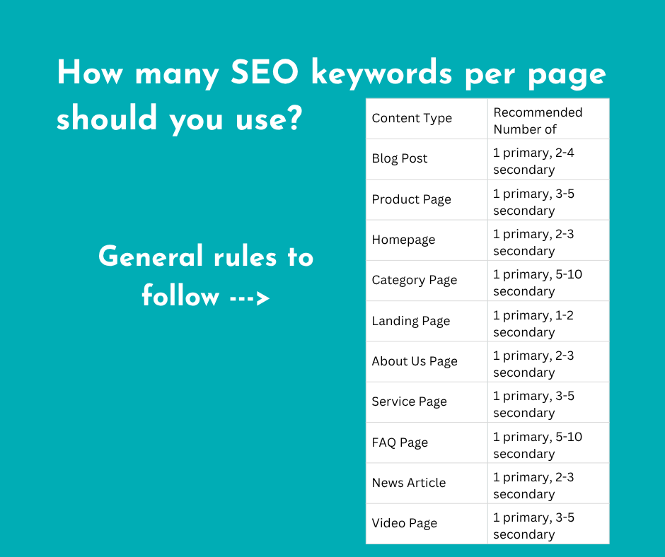 However, the number depends on the content type. A product description with a low word count needs more keywords (almost 5-10 per page) to rank. This isn't typical for blog articles, where one to four keywords per page suffice.