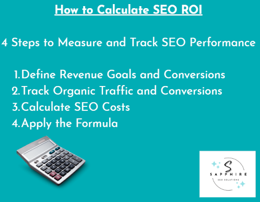 Business owners can calculate SEO ROI in four steps: defining revenue and conversions, tracking organic traffic and conversions, calculating SEO costs, and applying the formula.